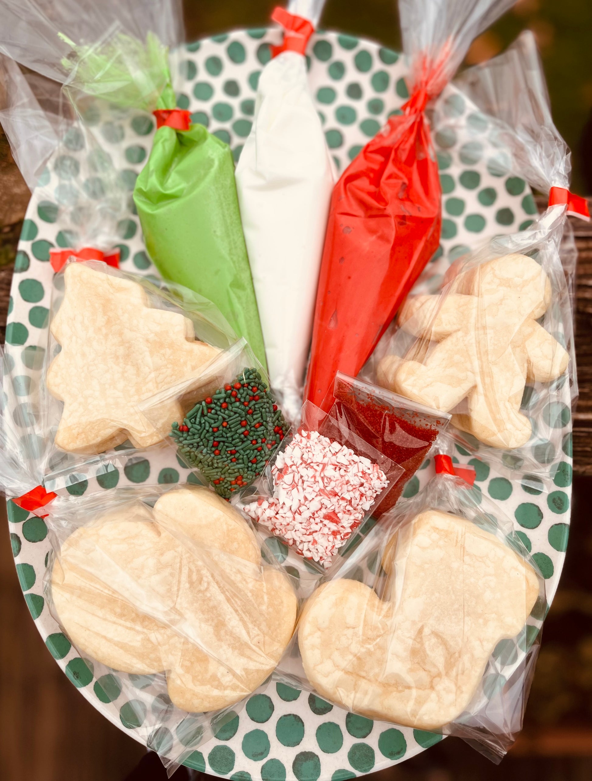 Have a little fun and make memories with this box of 12 sugar cookies, 3 royal icing colors, and sprinkles. This year two cookie kit options are available: traditional and dye free!